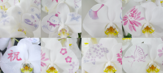 化粧蘭とは・・・蘭専用のパウダーを用いて、自然では出せない色彩や文字・絵柄を自由にお化粧した胡蝶蘭の総称です。